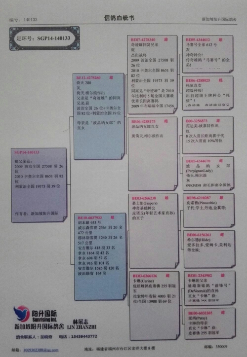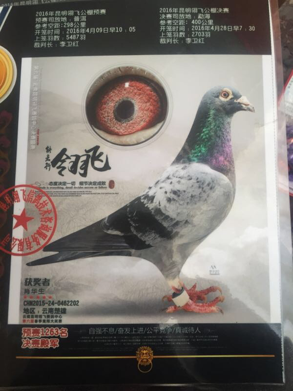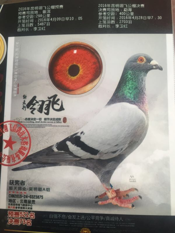 黑雨点雄鸽(血统:亨德利) 花喷点灰雌鸽(血统:幕利门和戈马力) 09年雄配14年雌在16年翔源达公棚第十名五百公里决赛。 这样配的原因:14年配雨点雌获500公里加强赛193名,考虑速度问题,换了灰白喷花雌鸽。产生明显效果,获得十名。所以今年为最佳配对。