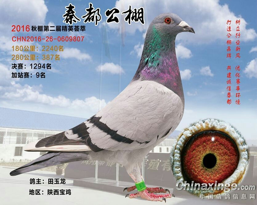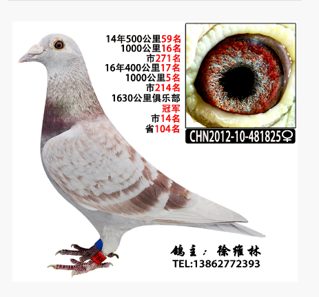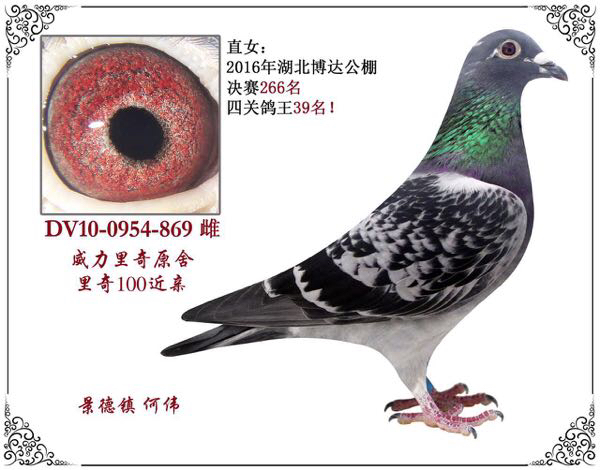 黑雨点雄鸽(血统:亨德利) 花喷点灰雌鸽(血统:幕利门和戈马力) 09年雄配14年雌在16年翔源达公棚第十名五百公里决赛。 这样配的原因:14年配雨点雌获500公里加强赛193名,考虑速度问题,换了灰白喷花雌鸽。产生明显效果,获得十名。所以今年为最佳配对。