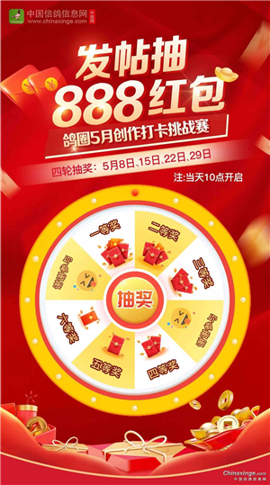 活动规则:活动期间,在鸽圈发帖打卡,勾选“5月创作打卡挑战赛”活动,即为参与成功。活动共设置四轮抽奖(每周一轮),每周打卡满4天,即可参与一轮抽奖,最多可参与四次抽奖,赢取至高888元现金红包。此外,活动结束后,打卡累计满20天以上,即可参与评选,获得惊喜礼品、大额积分等奖励。