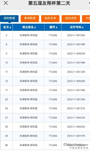 【第444集】牛人第一关取得完胜,第二关又取得不俗的战绩 温州苍南信鸽协会第五届友翔杯第二关,于10月29日早上6点40分在江苏镇江开笼放飞,共计上笼371羽赛鸽。比赛当天归巢71羽,归巢率19.13%。 钱招圣的一羽环号为2023-11-800272鸽子,于2023-10-29 14:41:01.890报到,空距532.589公里,分速1114.4031获得冠军, 泽源服饰—郑和国一羽环号为2023-11-801063,于2023-10-29 14:45:42.030报到,空距532.589,分速1269.1209,获得亚军, 季军何海豹+黄华畅的2023-11-801023获得,空距523.254,分速1092.0251。 特别是泽源服饰—郑和国,在第一关获得冠军、亚军、季军、5、6名,第二关又获得亚军、8、9、10、11、12、17、22、23、27、30、33、56名。特别是第一关的亚军,第二关又获得8名,估计此鸽应该是双关的综合冠军。