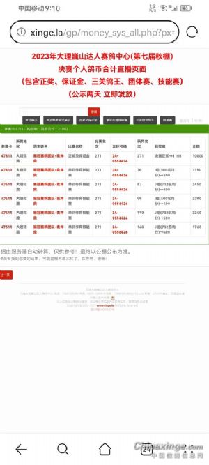 获得本次比赛前三名的鸽友分别是;冠军获得者李全中,赛鸽资料2023-26-0698137瓦灰黄眼雌,归巢时间14点33分01秒,比赛空距520.775km,飞行分速1260.889米。