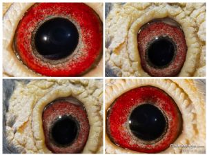 一共两幅图,每图上边的是两只不同的雄鸽,下面的是同一只雌鸽。有劳各位鸽友帮看看,单从眼砂上配对的话,那一对更合配?多谢啦!