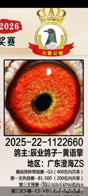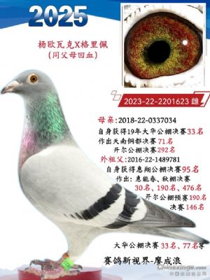 【2026年配对二】雄鸽利奥鸽王杨6113220外曾孙雨点砂眼345,之前配公棚加关18名曾作出公棚决赛270名等多羽成绩鸽。雌鸽是白爪雄女儿四关鸽王65名,曾作出公棚决赛462名和多羽成绩鸽,包括25年地方赛鸽王170名。