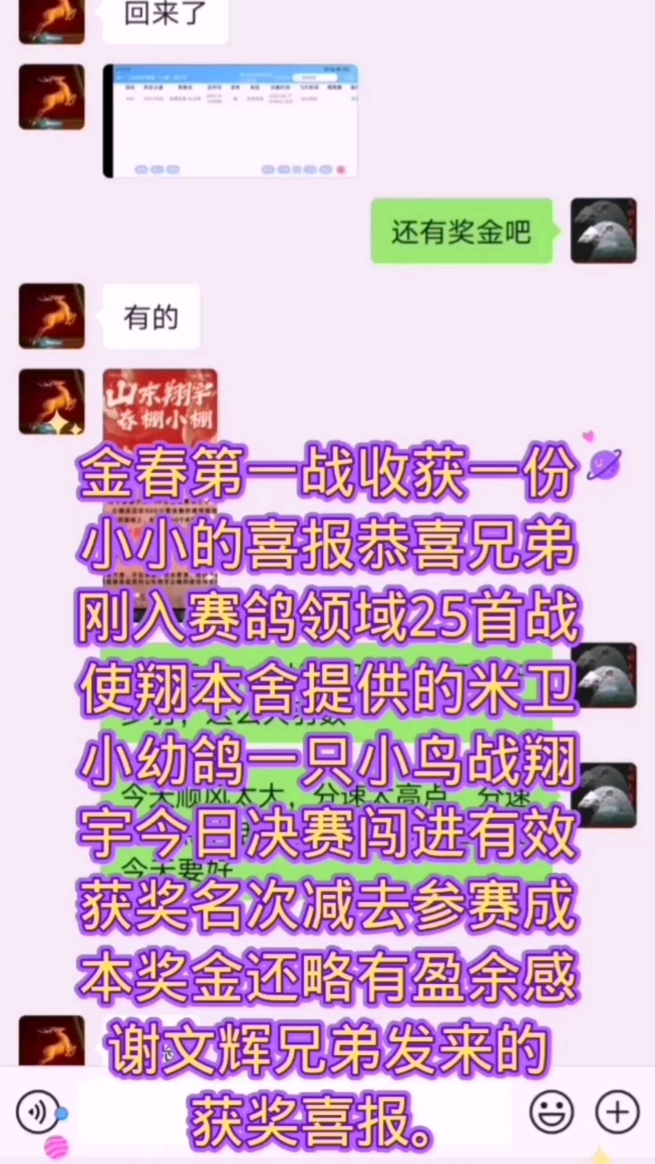 感谢甘肃-至尊宝来-孔文辉兄弟发来的获奖喜报。使用本舍提供的米卫小幼鸽一只小鸟战翔宇,收费站归巢1万9千羽。今天决赛闯进有效获奖名次。赛鸽比赛能赢就是上天最好的安排。祝贺兄弟
