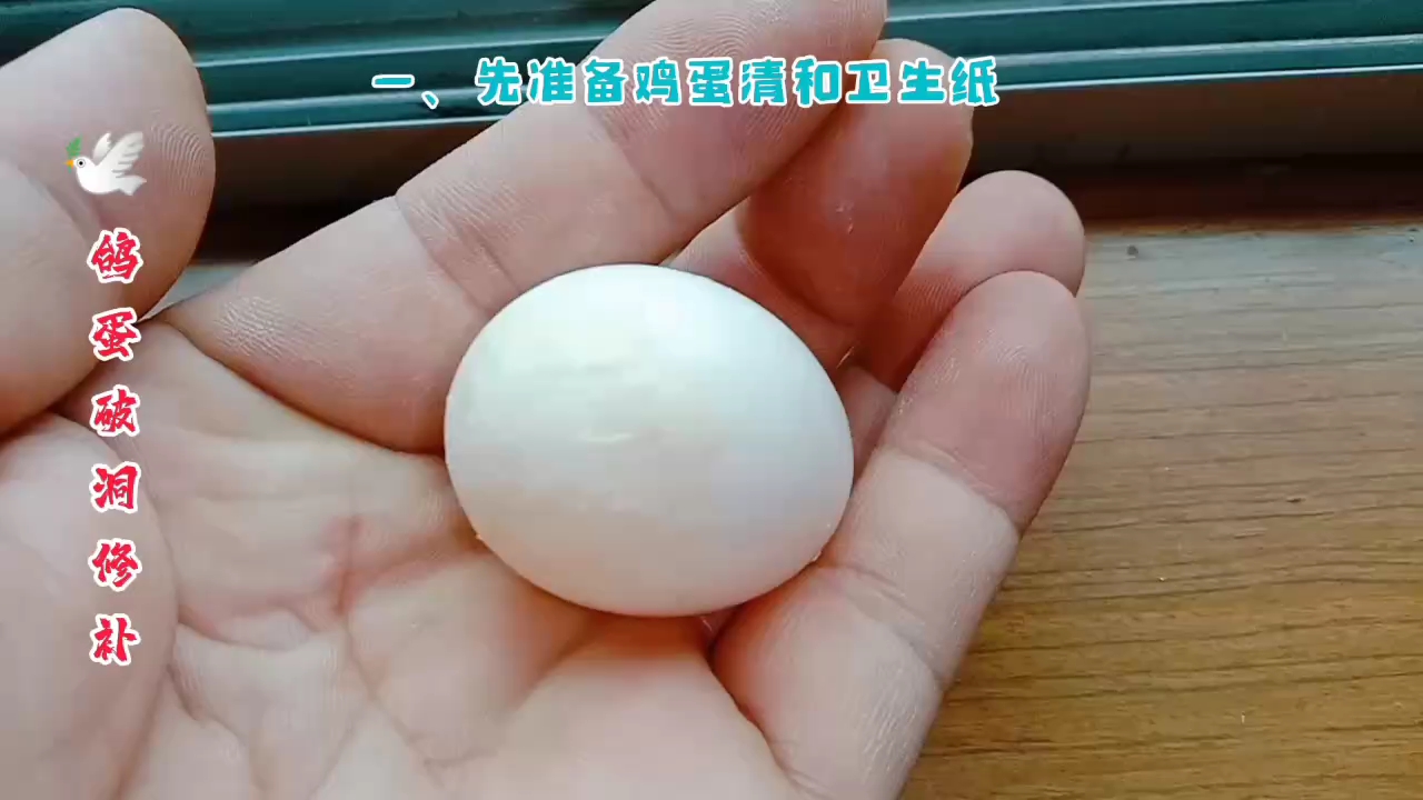 【鸽蛋修补小方法】前天修补了一枚因意外磕伤的鸽子蛋,伤疤比米粒小一些,还好蛋壳内的膜没有破,顺便就制作了这段小视频。这种修补方法用了很多年,特别简单还管用,其用到的材料和步骤如下; 一、准备鸡蛋清和一小片卫生纸(没蛋清也可以用书房内的胶水代替)。 二、将蛋清或胶水涂抹在破洞口,涂抹区域要适当。 三、用手撕卫生纸一小块,粘贴于修补处。 四、用同样方式粘贴2-3层晾干即可。