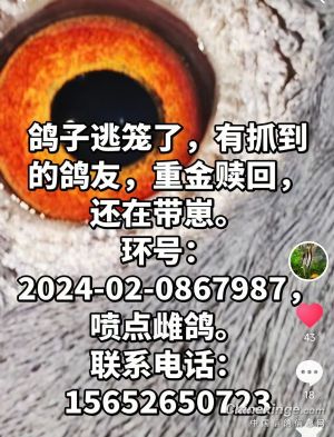 寻鸽启事,上海附近的鸽友,求助。家里种鸽逃笼了,有抓到的愿意赎回。不是啥好鸽子,但很喜欢,很亲人,一只上手的雌鸽。