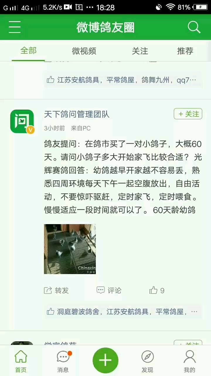 撞伤小鸽子伤口已缝合,并关小笼静饲养。顺便给管理员反映个问题,刚才发现贴子字数较多时,贴子的页面只显示一部分,另一部分无论怎么点击也没反应,后经缩减字数,能显示的也就是全部了。
