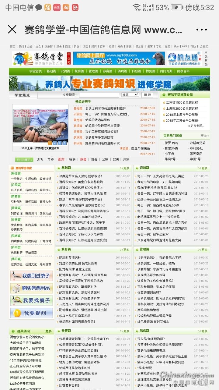 养鸽好帮手——我的养鸽导师中信网 养鸽几载其实最应该感谢的就是中国信鸽信息网 了。 在遇到困难时,只要发一个帖子就有很多热心网友为我解答。 在俱乐部栏里,我可以实时了解相邻城市的比赛情况,可以做出相应的排兵布阵; 在名鸽展厅栏里,我可以看到与自家主血相近的鸽系,可以看到名家的配对血统,为我的配对育种指明方向; 而在鸽圈里,没有KUAI手里的那么商业化,嘈杂,这里只是普通工薪鸽友抒发情感的净土 我喜欢这样,喜欢这里的管理员,只因那位管理员回复会尽快处理上传慢的问题,谢谢您!谢谢中信网!