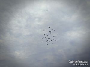 早晨起来放鸽子家飞,鸽子队行还是很平稳的,只有几个刚出笼的小鸽跟不上队伍,其它都很好,到现在没有发现素质不好现象,持续飞行50分钟样子,再坚持几天到9月初就要短程私训了。