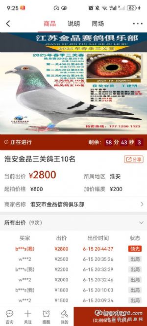 拍卖晚上截止,怎么会让自己的大铭鸽落入旁手。昨晚小鸽子都打了疫苗,老鸽子没有打。这两天大铭鸽追蛋,春棚的小鸽子已经15天左右了,选一只雄送万羽。