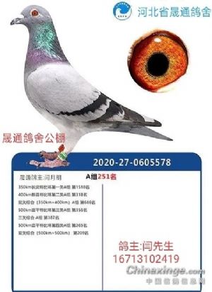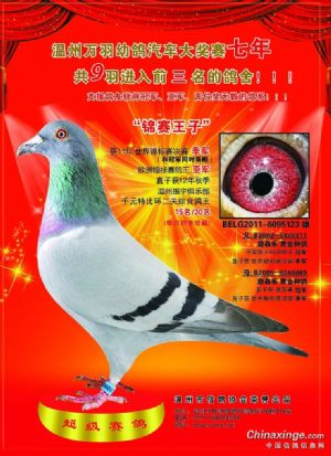 【每日一鸽】《三》“华兴皇帝”本身获得2000年世界锦标赛9名,是华兴鸽舍的起棚第一种公,做出“王子爸爸”2002-11-022534,本身获得2002年秋季温州瑞安市幼鸽大奖赛520公里决赛总冠军,已经发挥10代,而且连续10代代代出冠军,“王子爸爸”直系获得总奖金已达9位数,它本身是一羽中小体型的雄鸽,是纯华兴詹森麦克斯血系,也成就了国内众多的名家和大亨。代表直子“华兴王子”首次作出4羽子代,获得瑞安、平阳、苍南三县幼鸽大奖赛520公里决赛冠军、亚军、12、33名。直孙:“泉州冠军”获得2013年秋季龙湾千万元幼鸽大奖赛南路泉州站冠军,同窝获得13年500公里决赛66名。直孙:“百万皇后”获得2013年秋季温州幼鸽大奖赛520公里决赛亚军(售环18190枚)22项指定冠军。曾孙:“神奇王子”获得2016年龙湾竞技(联盟国际)南北四关冠军,包揽了800K、1800K、6800K三个级别环的冠军,拍出380万,当时国内拍卖的最高价。曾外孙:获得2018年唐山阳光寄养棚秋季鸽王总冠军。曾外孙:获得2019福建天宇三关鸽王大环冠军。正因为“华兴皇帝”的子代飞的非常好,所以江建兴先生几乎疯狂的引进世界锦标赛前100名中的20多羽,为以后的种鸽实力打下了坚实的基础。以上所列的赛绩这是其中的一部分,因赛绩太多不一一列举。