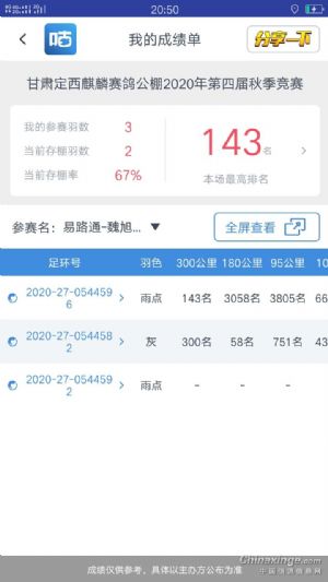 【丢不掉的菜鸟】今宝鸡铁路鸽会500km比赛,我实际空距519.868km,老弱病残凑了整10羽(其中有2014和2013年的老鸽子,另有一羽已经两年没飞了,而且这次是直接上500km的比赛),至天黑比赛结束归9羽(鸽会总共归504羽),分别排;第38、129、161、182、247、268、363、442名,小指成功。值得一提的是;这站的38名,分速 1374.372 米,也是上站300km的38名。另一个让我高兴的是;市鸽会四关鸽王赛第四关的六名鸽,500km归巢歇了整3天,又被我狠心送上笼,结果今天顺利归返排268名。这羽瓦灰雌今年共飞一次300km,一次400km,四次500km。