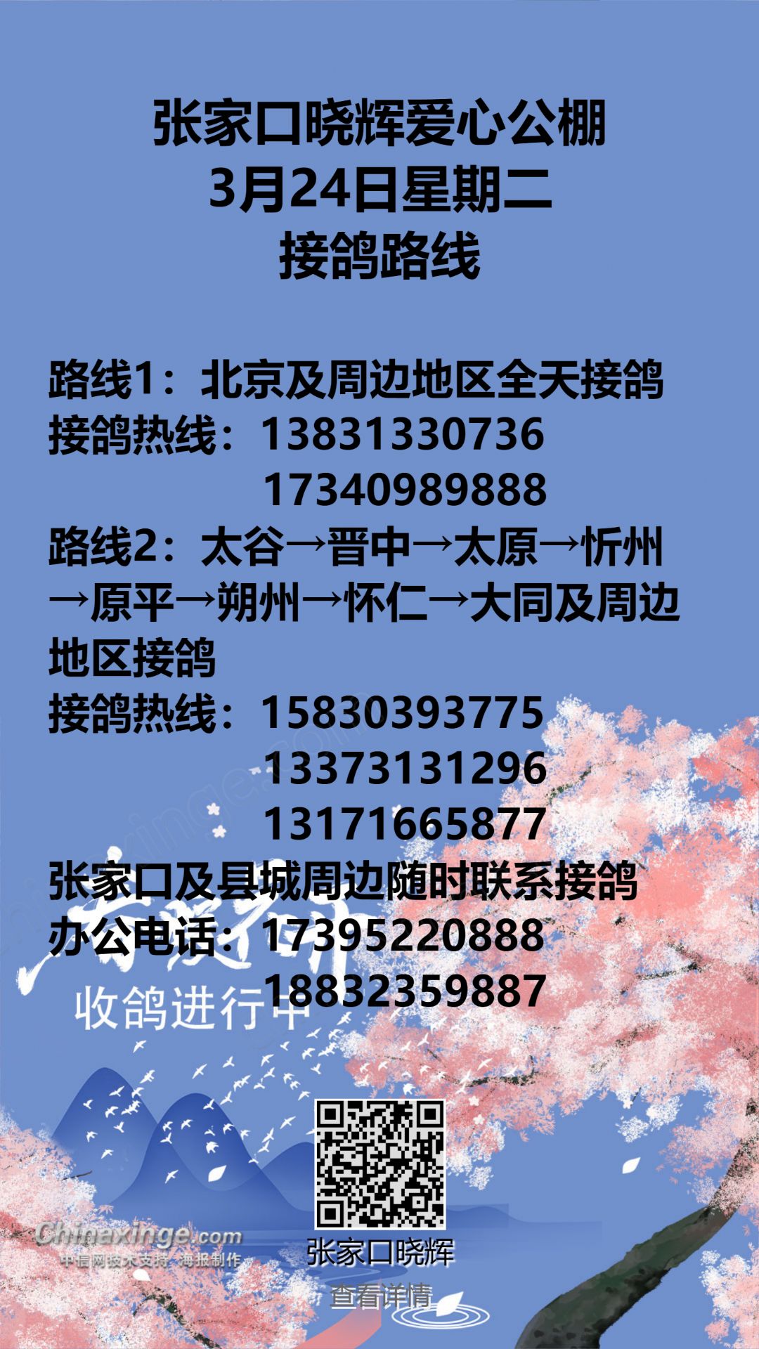 张家口晓辉爱心公棚3月24日接鸽路线