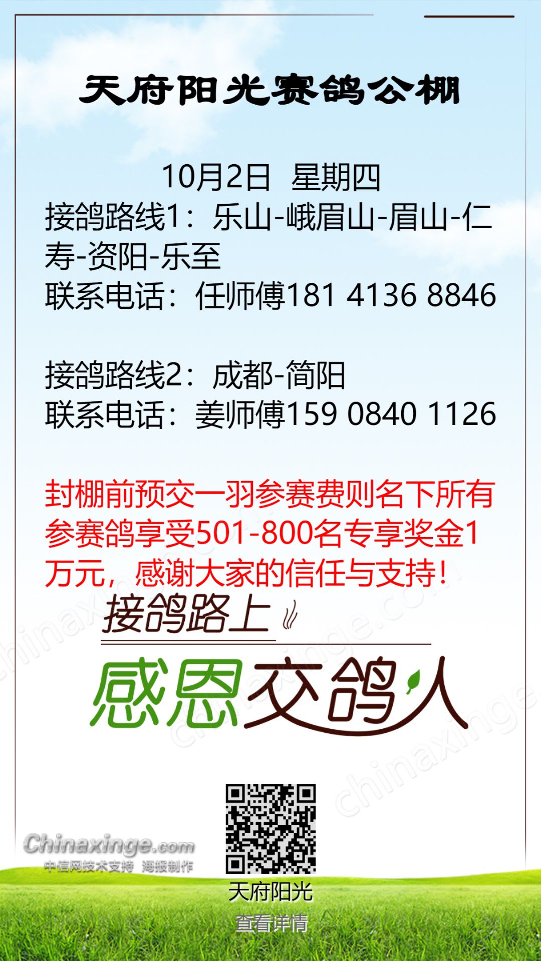 天府阳光春棚10月2日接鸽路线
