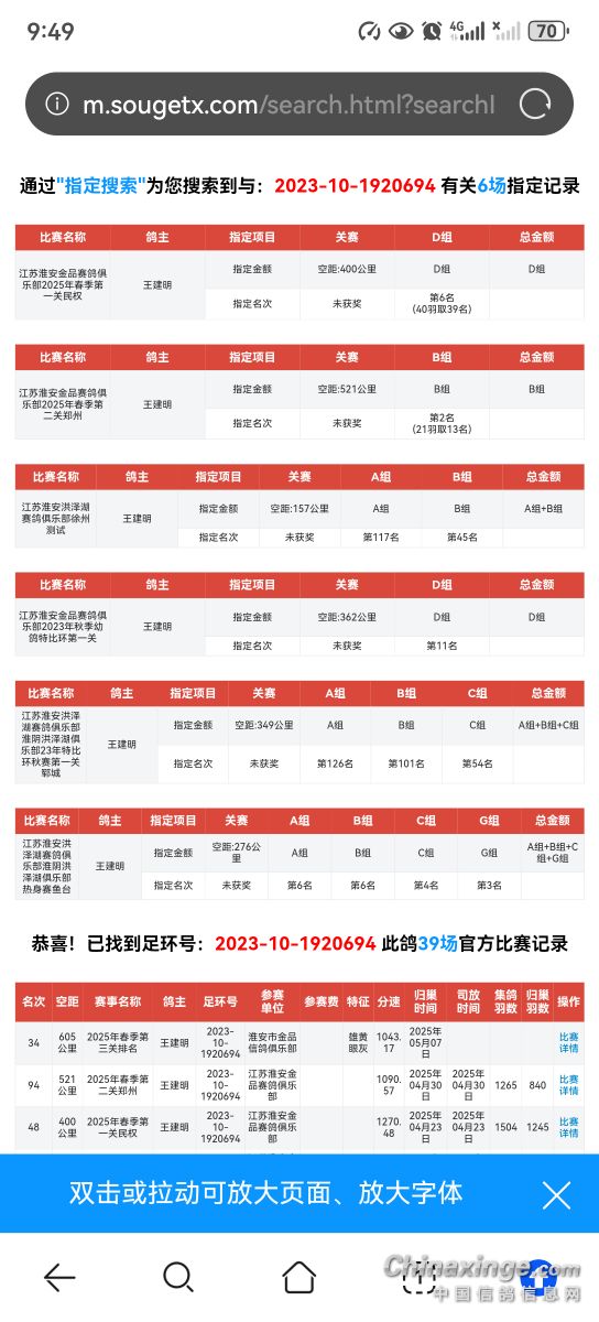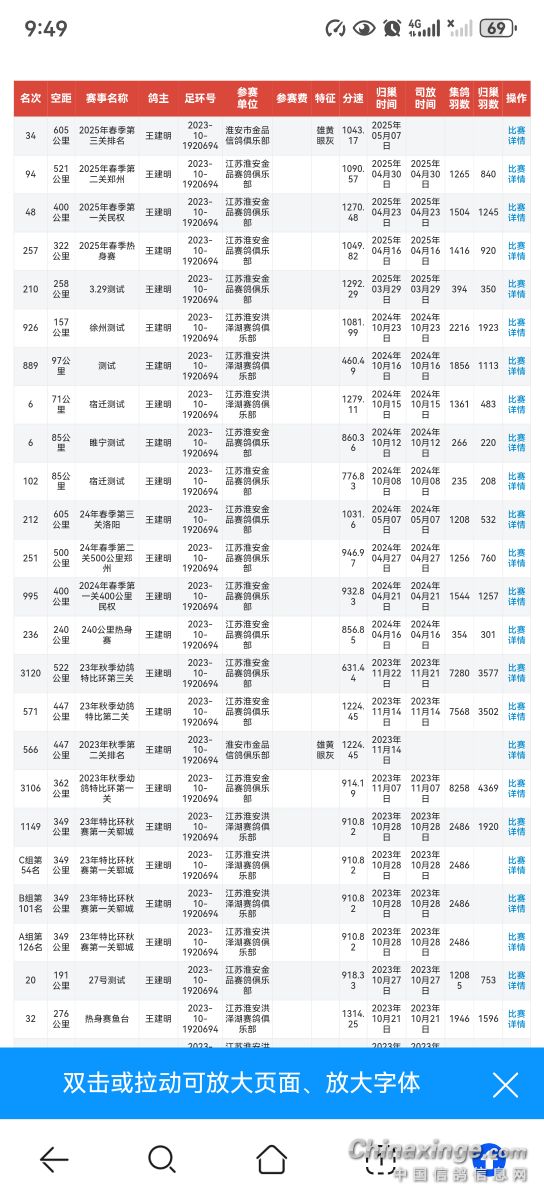 今天看俱乐部群里有一只豪强说鸽子生病了,已经死了20多羽,估计是新城疫,老会长说,病鸽子不容易好,其实我的大铭鸽694在2023秋赛第四关回来以后整棚当年的鸽子都生病,死的就剩下694和1907724两只小鸽子了,其中大铭鸽694都已经头歪了,都以为救不过来了,喂了外脖康,慢慢的头正过来了。都说生过病的鸽子就没有用了,大铭鸽694可能是个特例,今年春赛三关赛关关进奖。实现了从320公里,400公里,500公里,600公里,1000公里都有100名以内的名次的赛事大满贯。也是棚里唯一的有前10名(春赛鸽王10名)战绩的大铭鸽。