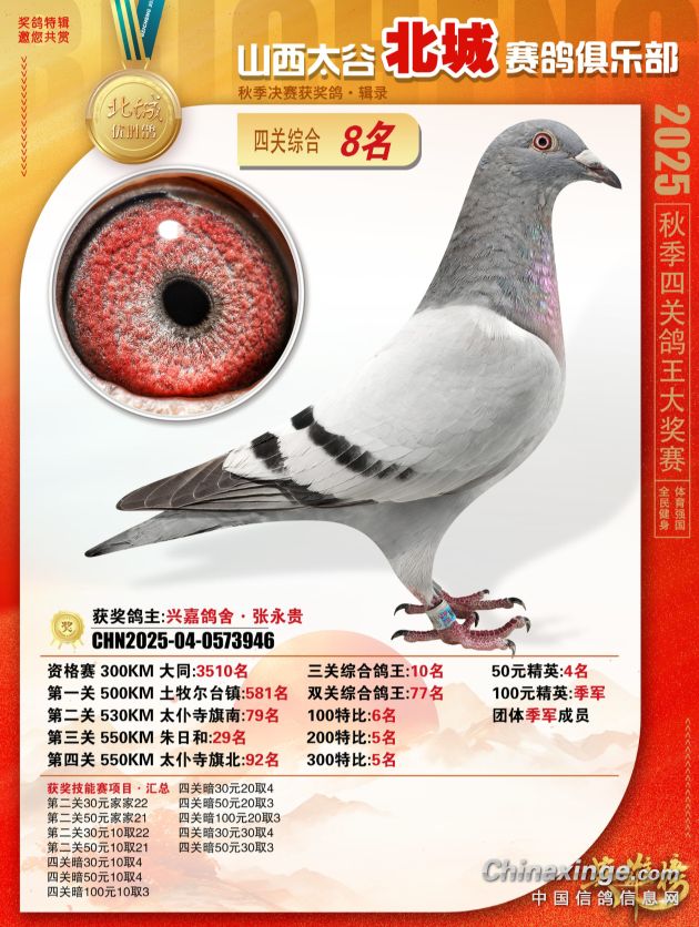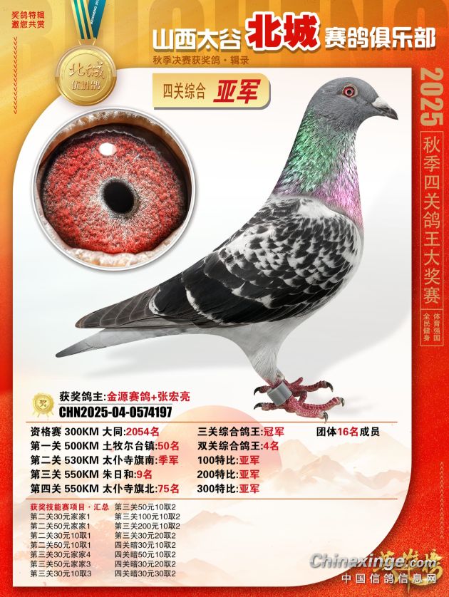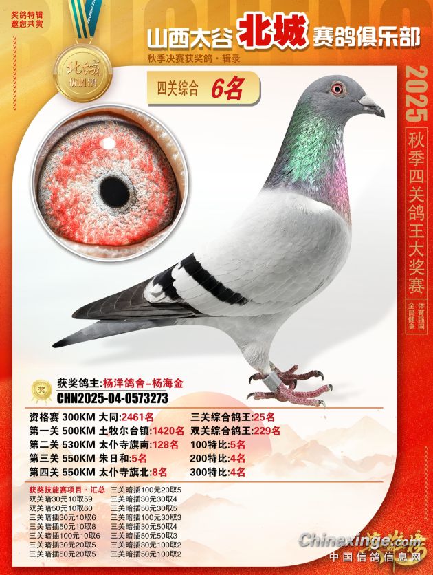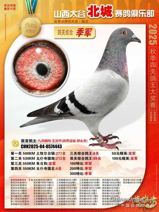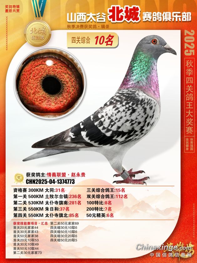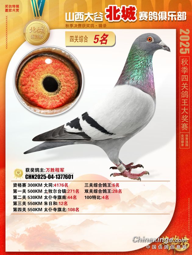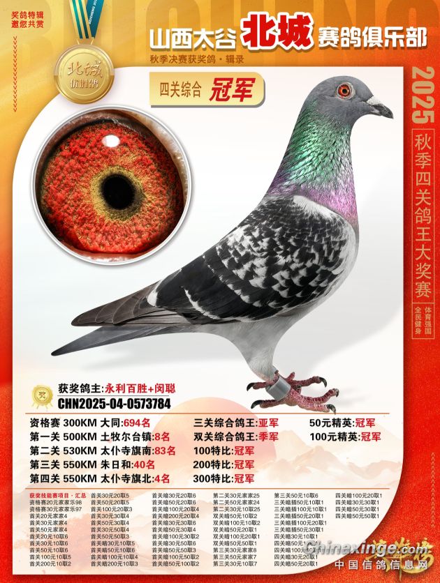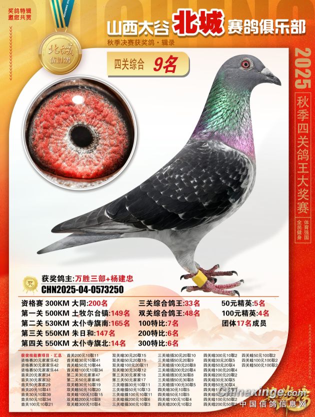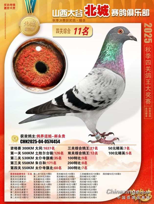 山西太谷北城赛鸽俱乐部2025年秋季四关鸽王大奖赛,四关综合鸽王前11位欣赏(缺少第4、7名照片),冠军获得5项指定冠军。