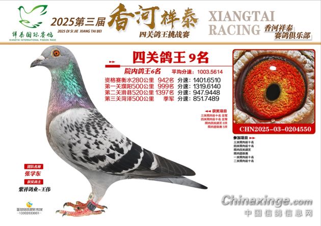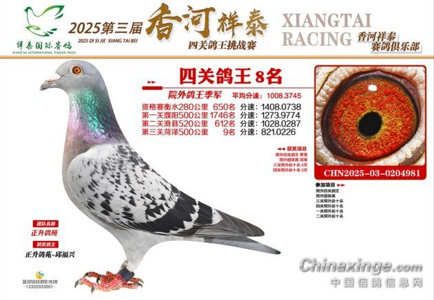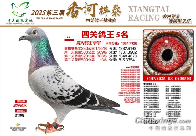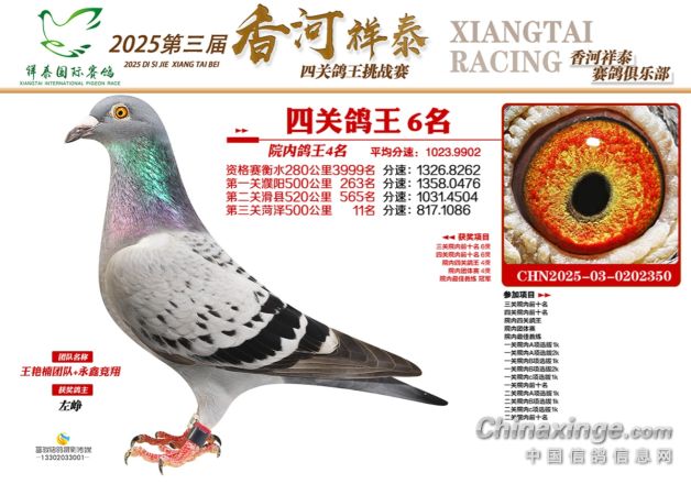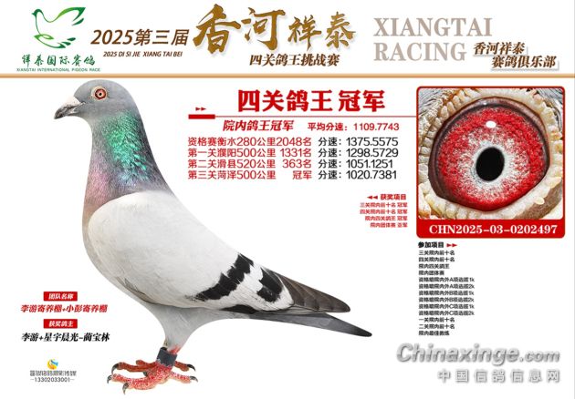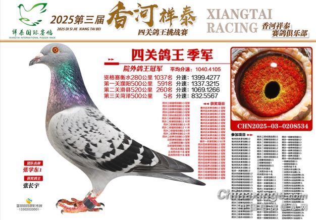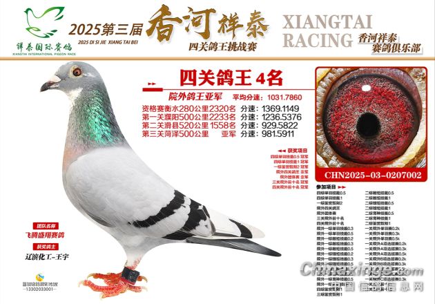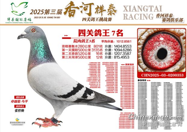 香河祥泰赛鸽俱乐部2025第三届四关鸽王挑战赛前九位欣赏,四关鸽王7名是副其实的指定大赢家,获得43项指定冠军,这在全国应该也是很少见的。