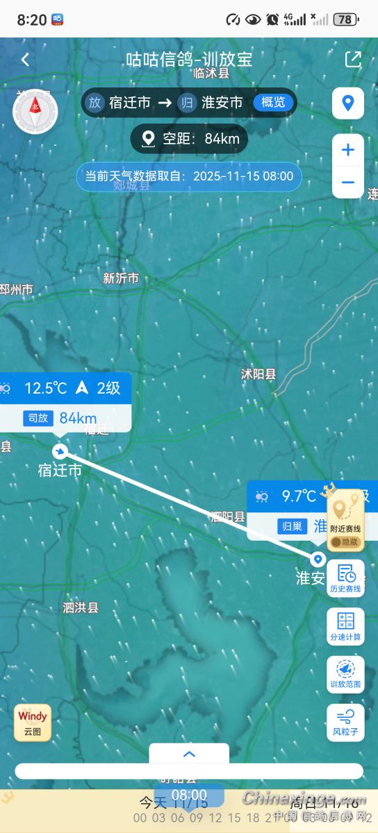 到宿迁西沙镇,吃了早饭,到老地方醒笼,于8点28开笼,薄雾,有太阳,顶风,76分钟见鸽。预计,80分钟见鸽。车到家,鸽子到家。