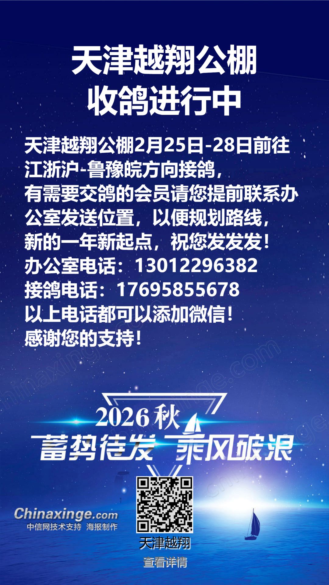 天津越翔公棚6月1日前往江苏一带接鸽,欢迎致电!