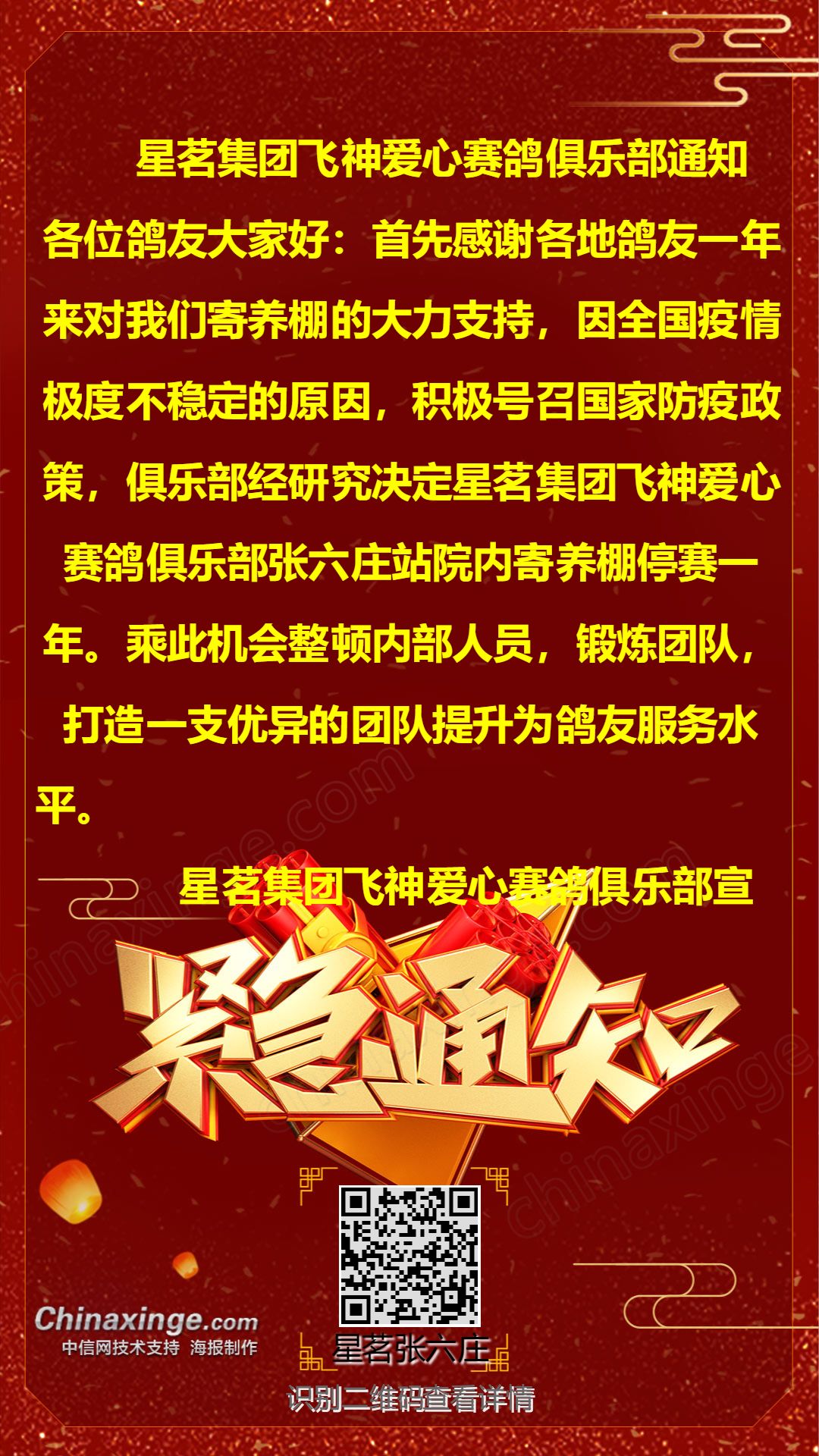 星茗集团飞神爱心赛鸽俱乐部停赛通知
