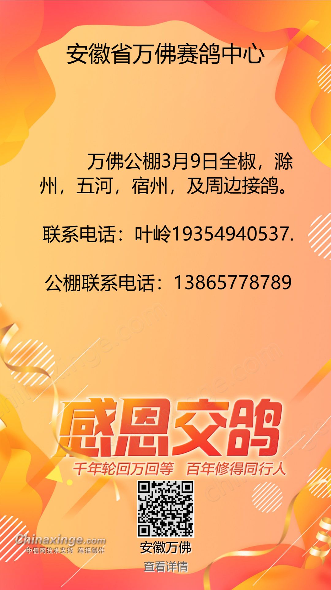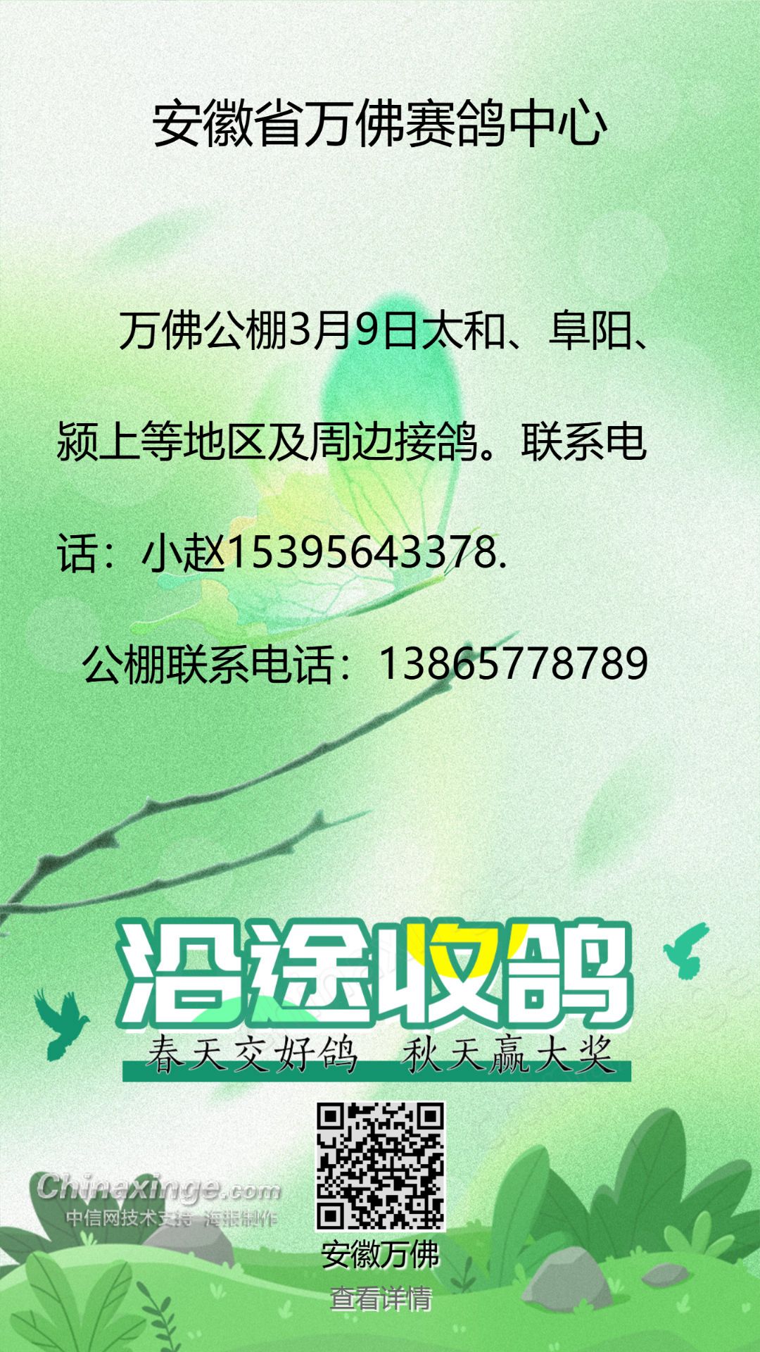 万佛赛鸽中心3月9接鸽公告