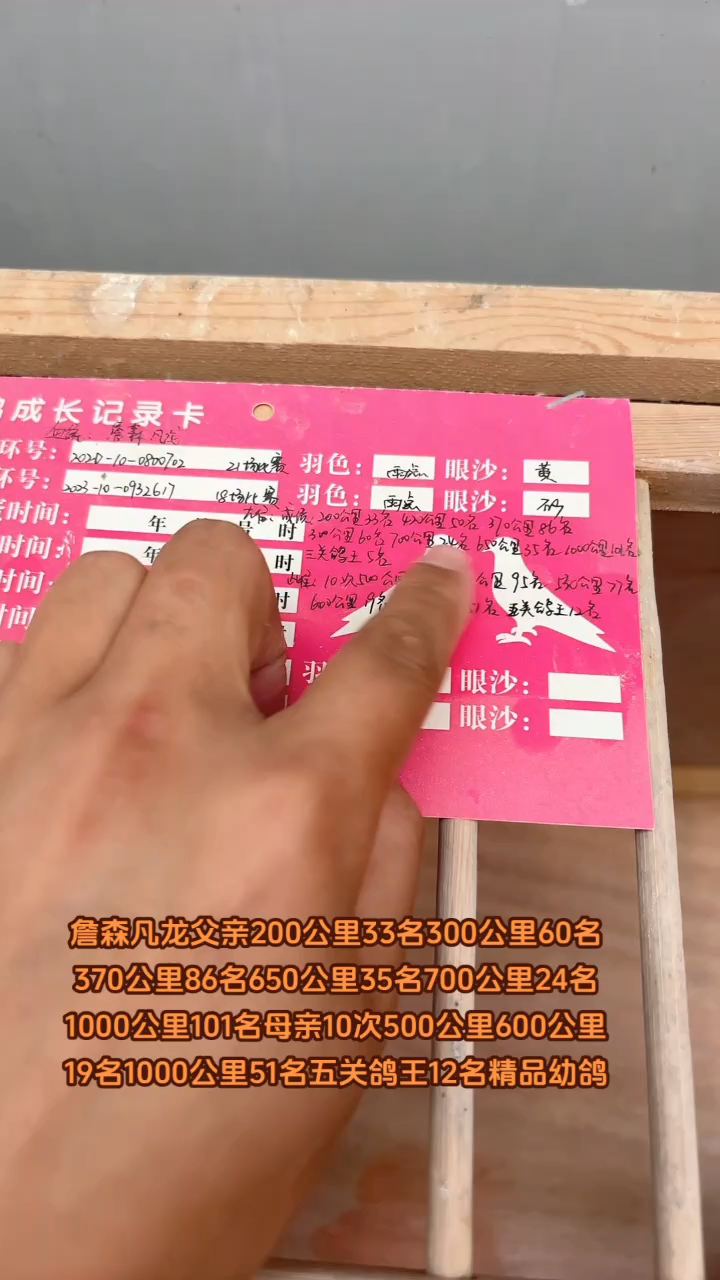 詹森凡龙父亲200公里33名300公里60名370公里86名650公里35名700公里24名1000公里101名母亲10次500公里600公里19名1000公里51名五关鸽王12名精品幼鸽平辈公棚决赛23名