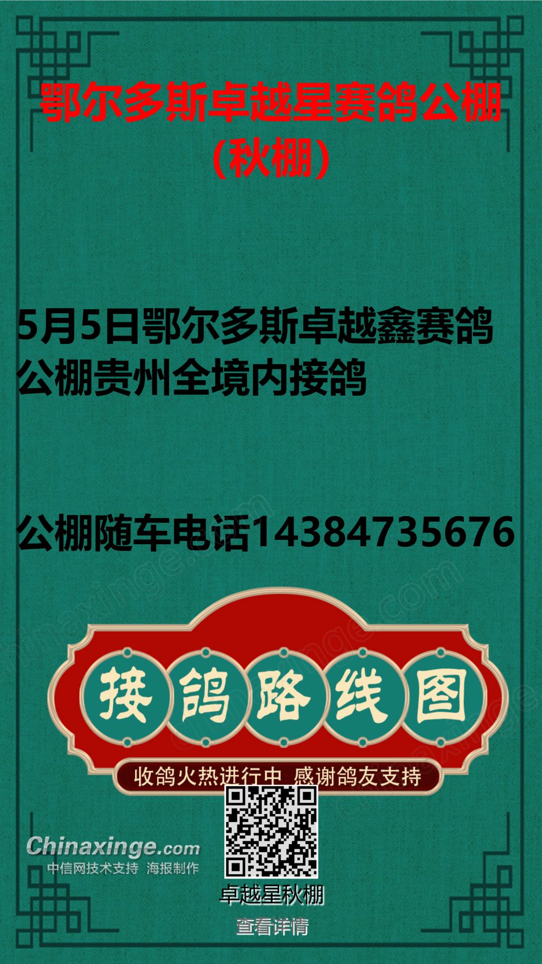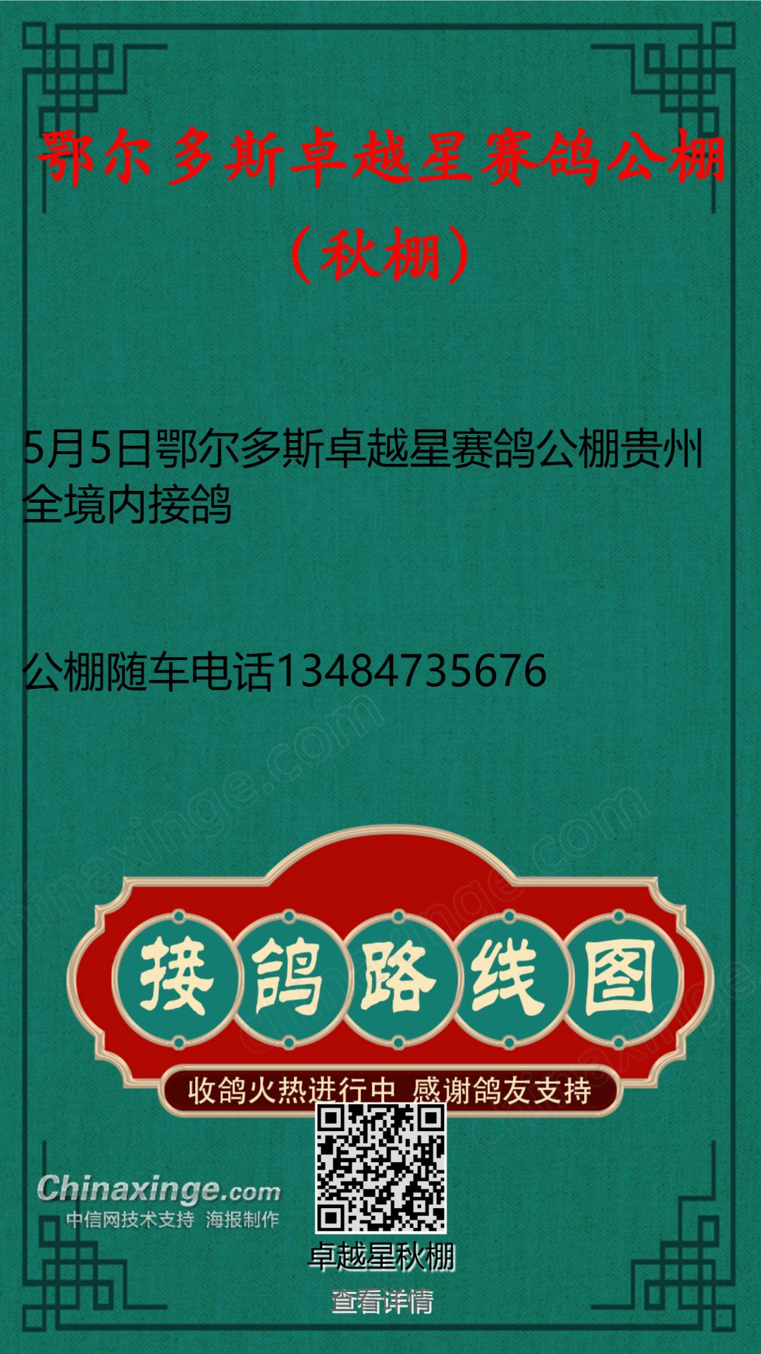 5月5日鄂尔多斯卓越星赛鸽公棚贵州全境内接鸽