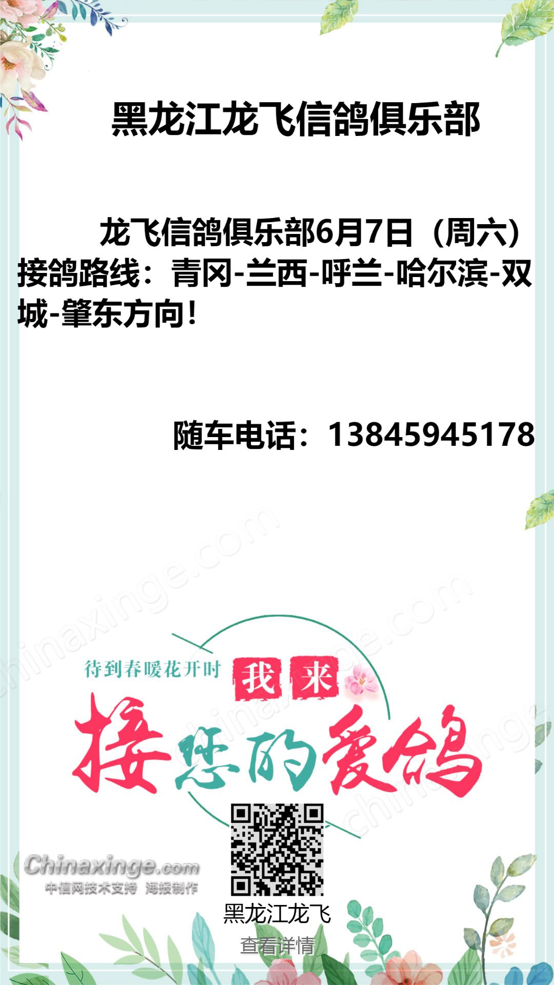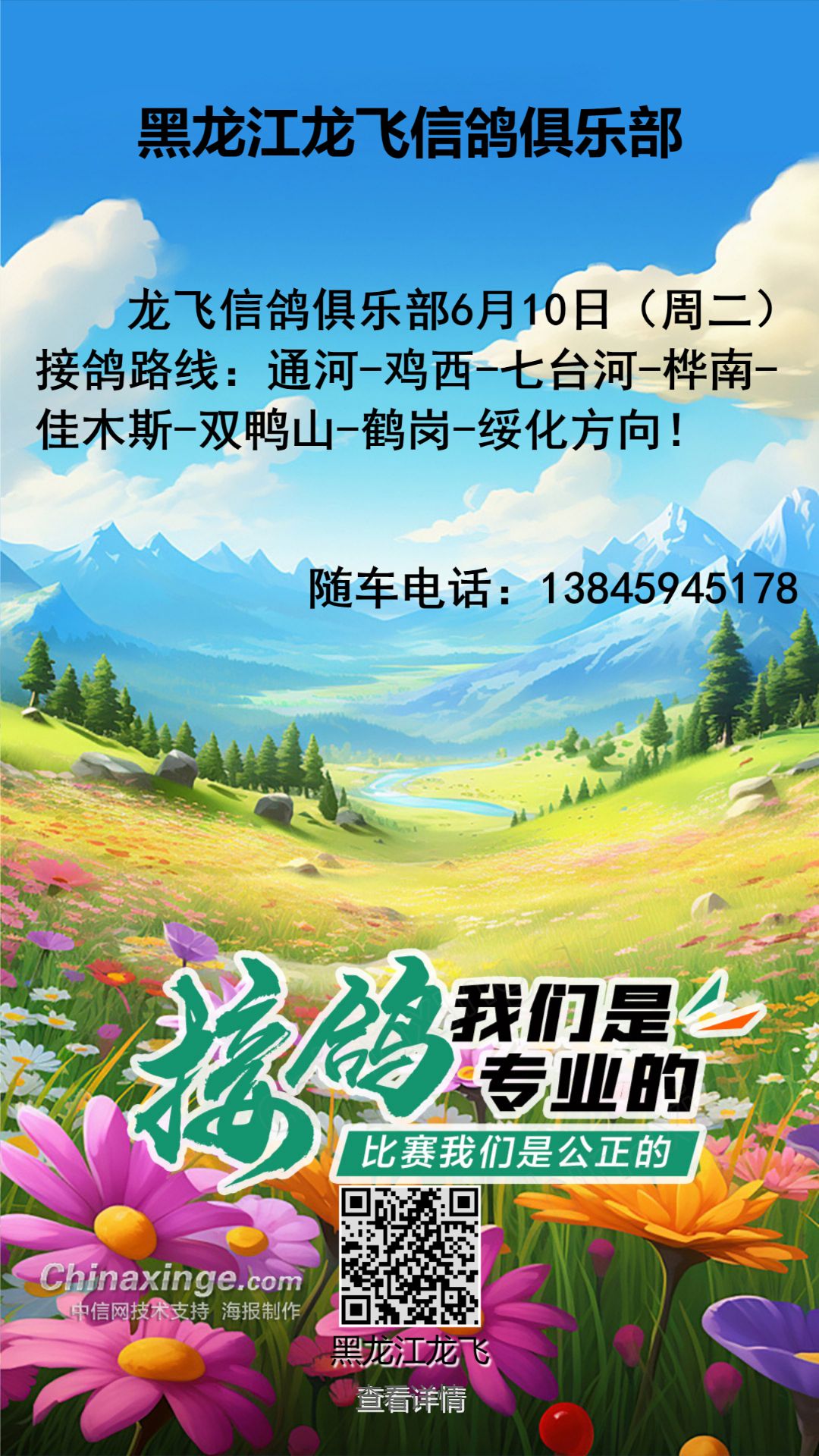 黑龙江龙飞信鸽俱乐部6月25日哈尔滨接鸽路线
