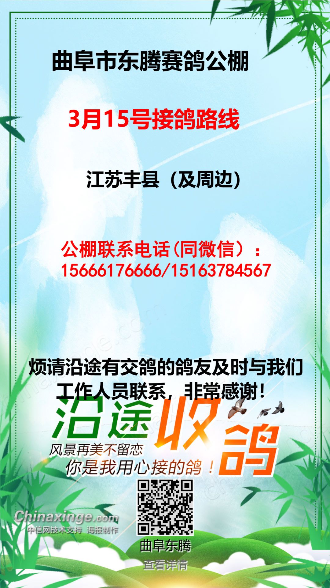 曲阜市东腾赛鸽公棚2026年秋赛3月13号接鸽路线