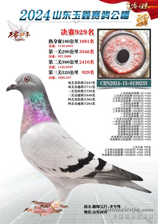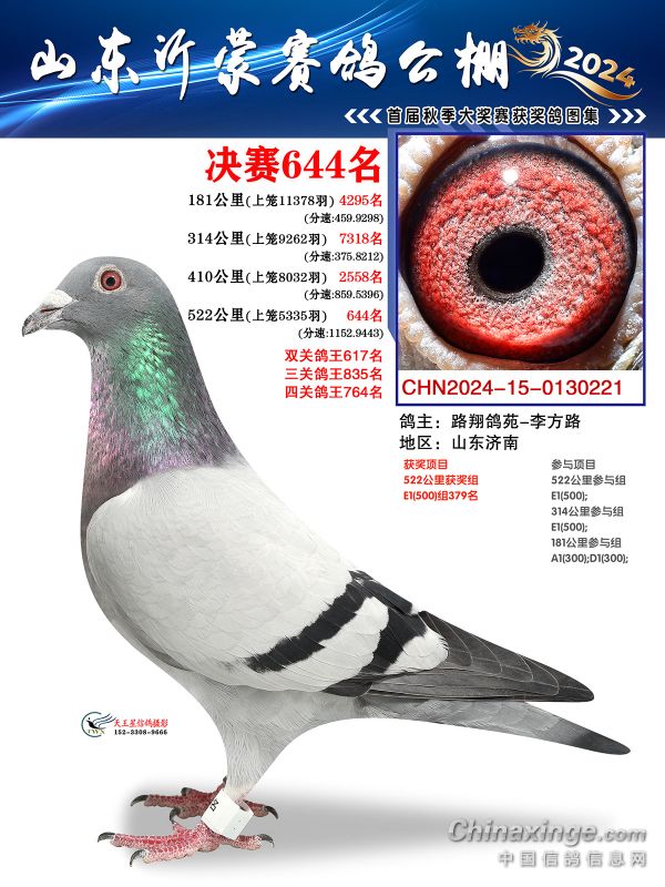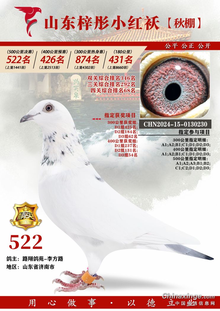 山东商河-路翔鸽苑-李方路 主要血统:速霸龙,战神家族, 盖比, 戈马力 ,鲁道克拉森,小白12 公棚进奖数羽(冠军,前十,三关鸽王) 路翔鸽苑-李方路138.6402.5136微同步