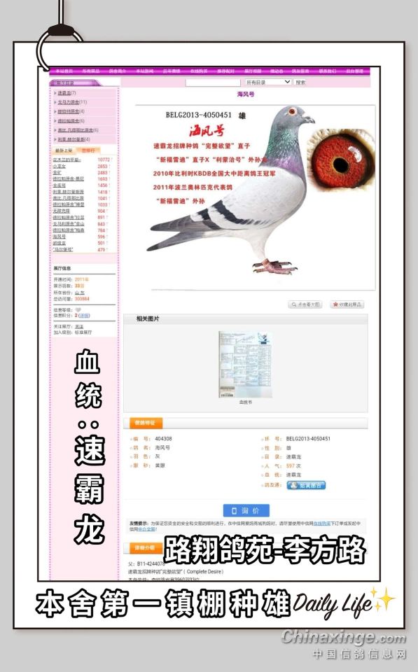 发表了鸽舍文章 路翔鸽苑-李方路 主要血统:速霸龙,战神家族,盖比, 戈马力 ,鲁道克拉森,小白12 ...