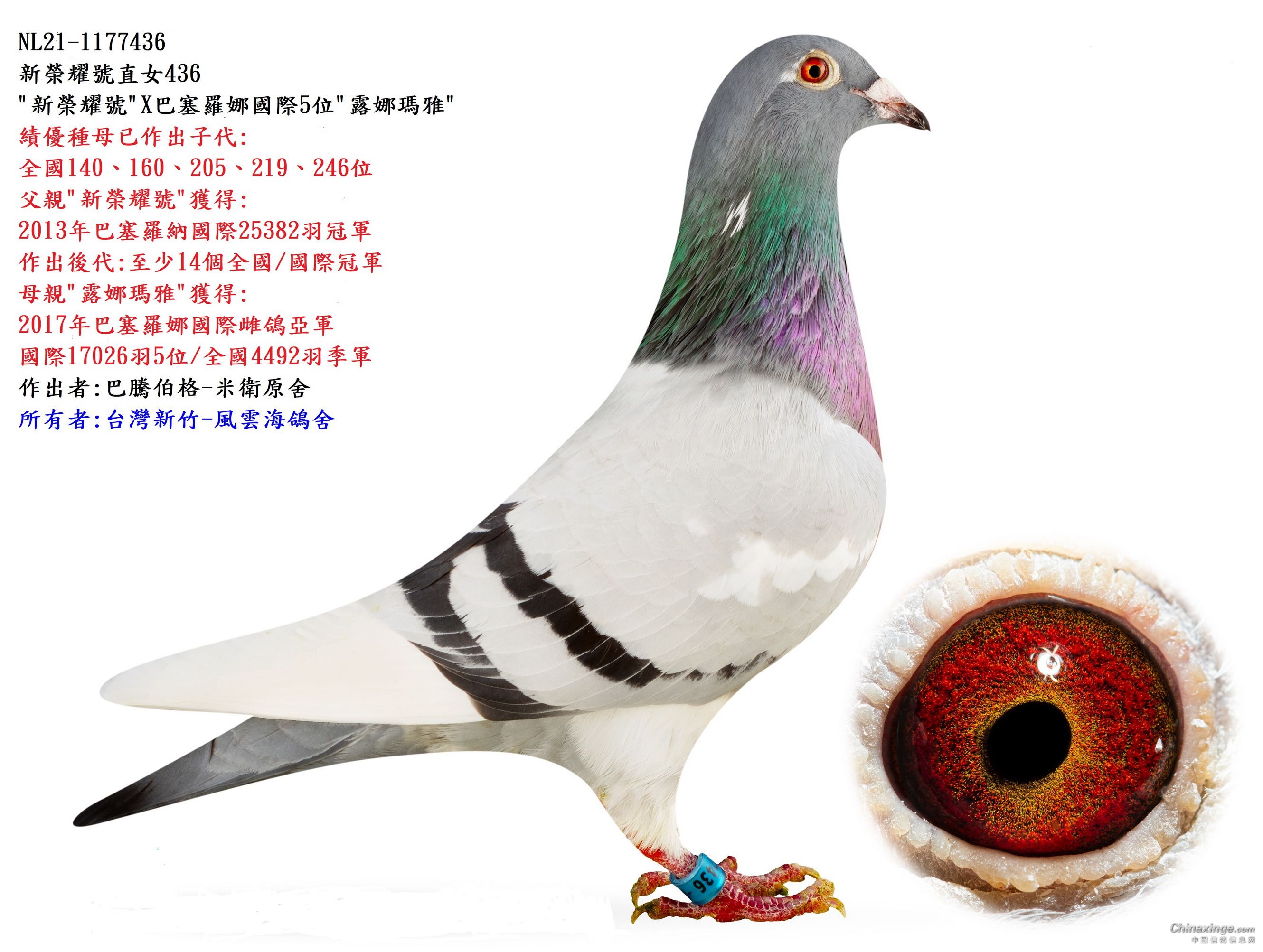 一流好鴿不嫌少,一流素質好基礎,一流家族稱霸路。 環號:NL21-1177436 作出者:巴騰伯格-米衛原舍 所有者:台灣新竹-風雲海鴿舍 羽色:灰白羽 眼色:育種深黃眼 體型:中型 血統:榮耀露娜 出生日期:2021年 備註:新榮耀號直女436 鴿子行不行,好不好,能不能,只有鴿主及引進的鴿友飛了最清楚。 新榮耀號於2021年無形,此羽績優金母436在歐洲地區已經作育子代發揮不少。 也許新榮耀號作出最後一羽直女,引進台灣後產生轟動台灣最發揮、最有實力、也是最恐怖的適合台灣海翔的超級鴿。 風雲海鴿系家族有此信心及實力。喜歡的鴿友就加減用,不喜歡的鴿友請跳過。 "新榮耀號"X巴塞羅娜國際5位"露娜瑪雅" 超級績優種母已作出子代獲得: 2023年波爾多全國第2賽區140位/2023年拿邦全國160位/2023年拿邦全國219位/2024年達克斯全國205位/2024年拿邦全國246位。 父 鴿:BE2008-2222675 灰白羽 ♂ 新榮耀號 本身賽績:2011年巴賽隆納國際26650羽41位分速1340米/分。2011年巴塞隆納國際12281羽全國8位。2012年巴賽隆那全國11590羽323位分速1061米/分。2013年巴賽隆納國際25382羽總冠軍分速944米/分未達1000公尺是場艱難的競翔比賽。 並且榮獲:2011~2013年巴賽隆納3年國際賽金翼獎冠軍榮耀。 母 鴿:NL2015-1259266 班♀ 露娜瑪雅 本身賽績:2017年巴賽隆納國際雌鴿組亞軍。2017年巴賽隆納全國4492羽季軍。2017年巴賽隆納國際17094羽5位。史上最艱難的一屆巴賽榮納賽事之一。 最新作育子代獲得:NL22-8442270於2025年巴賽隆納15508羽國際7位。2025年巴賽隆納荷蘭全國4515羽季軍。空距1146公里分速944公尺/分。作育子/孫代獲得:2020年巴賽隆納全國88位/2020年阿讓全國90位/2021年波品納全國100位/2022年波品納全國季軍/2022年卡奧爾全國第2賽區10位/2022年波品納全國17位/2022年卡奧爾全國第2賽區85位/2022年波品納全國113位/2023年波品納全國25位/2023年波品納全國119位/2024年波品納全國55位/2024年巴賽隆納全國
