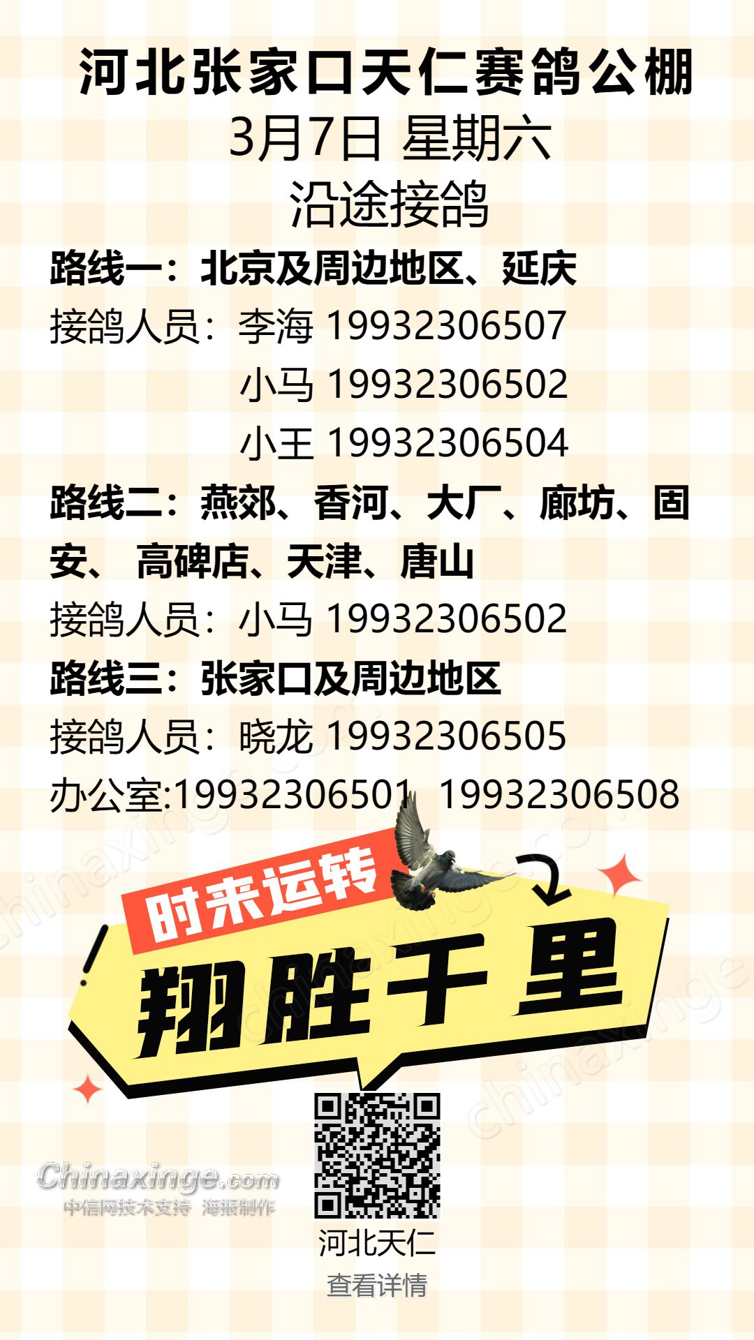 张家口天仁公棚3月7日星期六接鸽路线