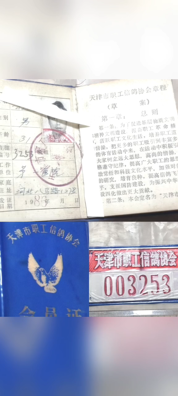 八十年代初,天津市信鸽协会筹备成立初期阶段,津卡老足环,品相完整,老物件难得。附图为1985年天津市秋季成鸽竞翔归巢证书。