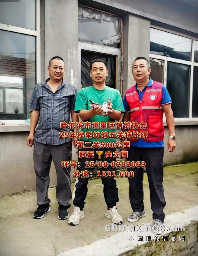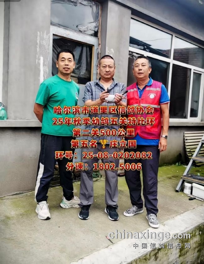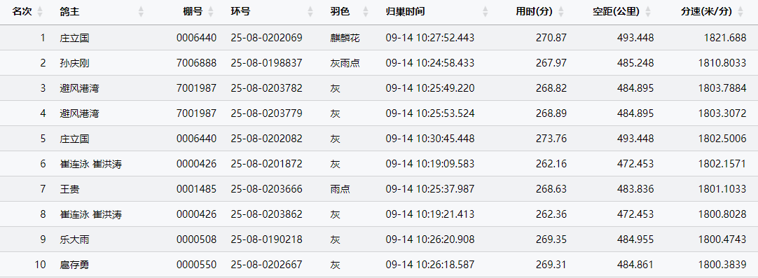 鸽友庄立国的一羽麒麟花25-08-0202069,于上午10时27分52秒归巢,空距493.448公里,飞出1821.688米/分的超高分速,摘得桂冠。该鸽友另一羽25-08-0202082也在三分钟后归巢,分速1802.5006米/分,拿下第五名的好成绩。