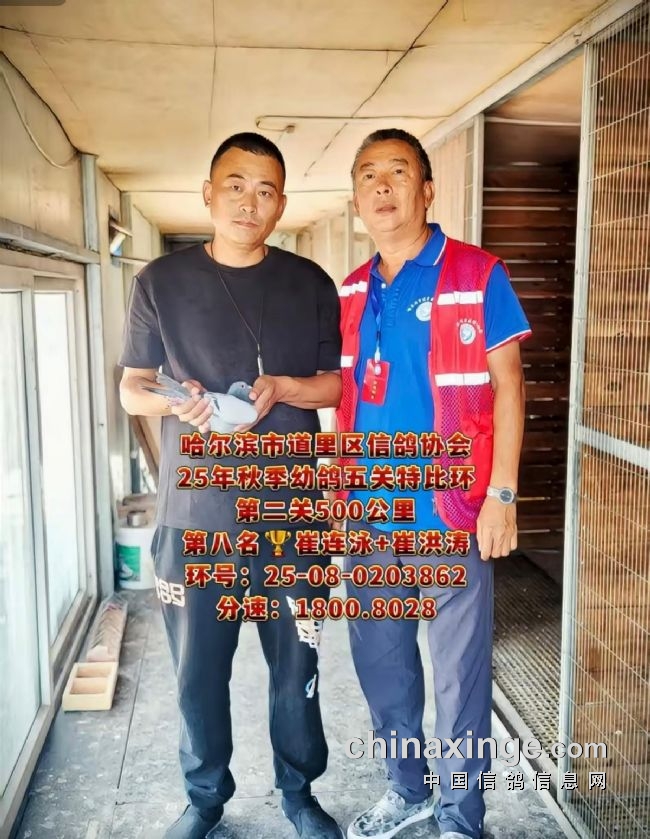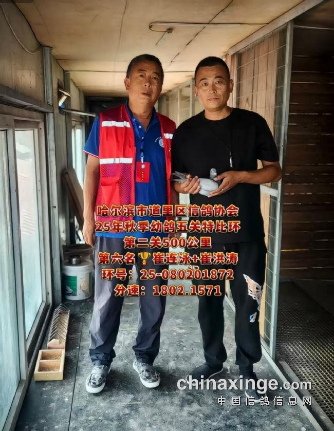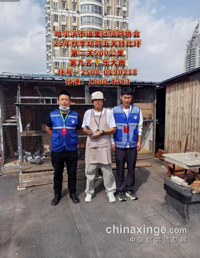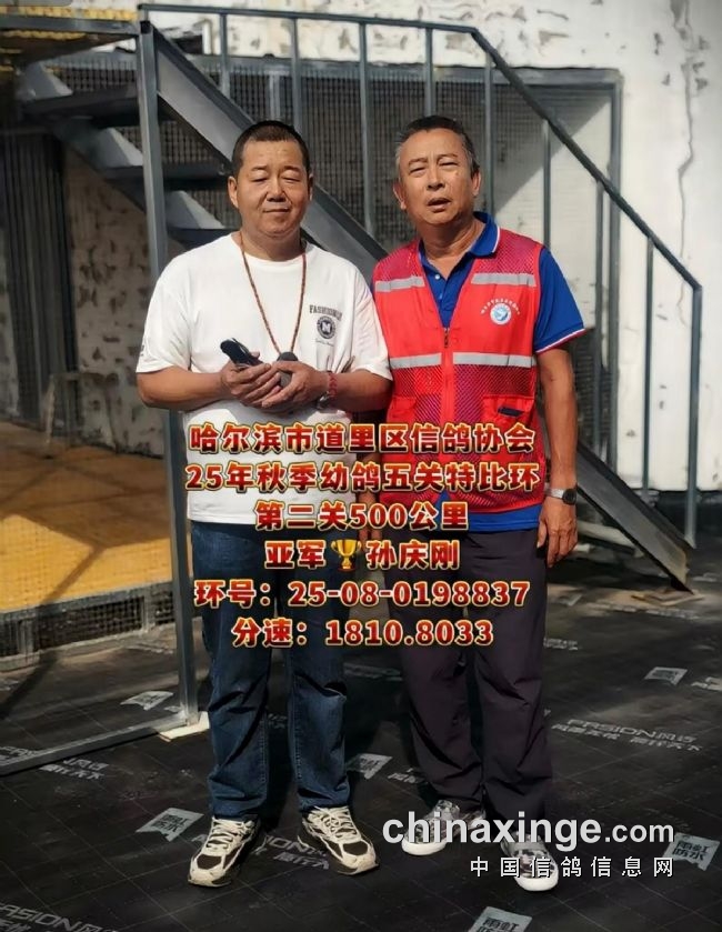 鸽友孙庆刚的一羽灰雨点25-08-0198837,于上午10时24分58秒归巢,空距485.248公里,分速1810.8033米/分,拿下亚军宝座。