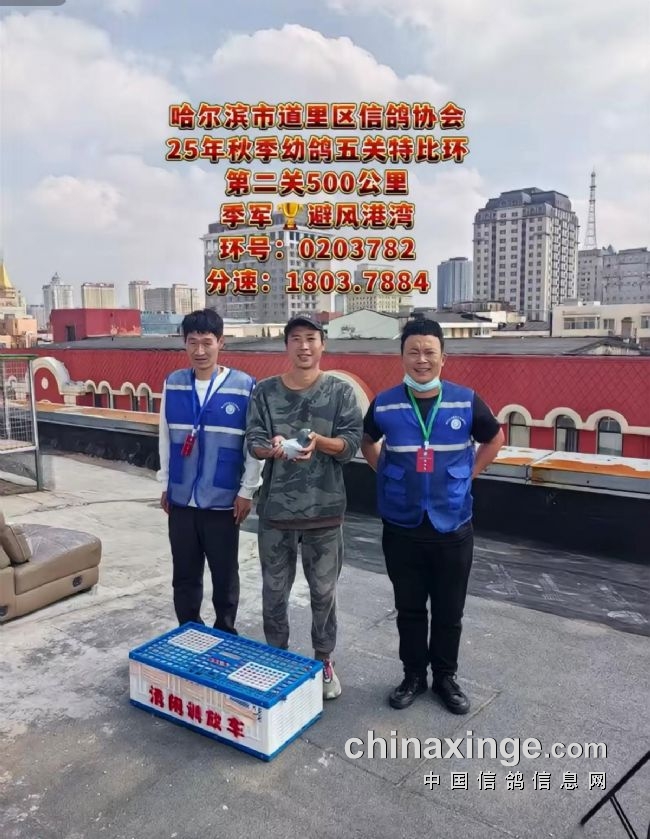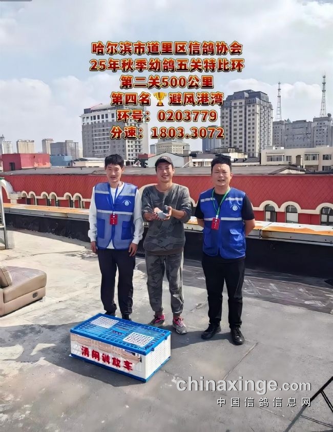 鸽友避风港湾的两羽赛鸽同时归巢,一举夺得季军与殿军的荣誉。季军鸽于10时25分49秒归巢,环号25-08-0203782,羽色灰,空距484.895公里,分速1803.7884米/分。殿军鸽环号25-08-0203779,羽色灰,分速1803.3072米/分。