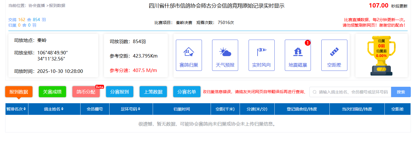 川鸽难飞,秦岭难越;群羽出征,归者寥寥。10月30日,四川彭州、绵阳、德阳、什邡等地多家鸽会同步开启秦岭站决赛,约四千羽赛鸽迎战这一极具挑战的赛线。然而,受复杂地形与恶劣天气双重夹击,归巢形势严峻——三家鸽会归巢率不足三成,什邡师古分会在开笼两日后仍零归巢,足见赛程艰险。下面来看比赛详情: