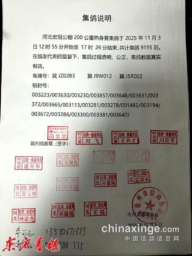 集鸽:11月3日下午集鸽,由沧州市信鸽协会派出裁判组执裁,100公里训放第6、106、206、306、406名、作为驻棚代表入场全程监督。集鸽于2025年11月3日12时55分开始至17时26分结束,共计集鸽9195羽。集鸽过程透明、公正,集鸽数据真实有效。