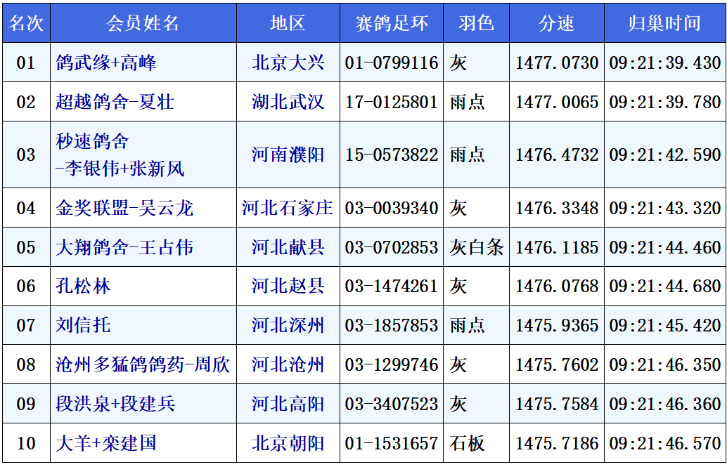 冠军:北京大兴鸽友鸽武缘麾下悍将01-0799116灰,于09:21:39.43首叩鸽钟,以1477.073米/分速摘取桂冠;