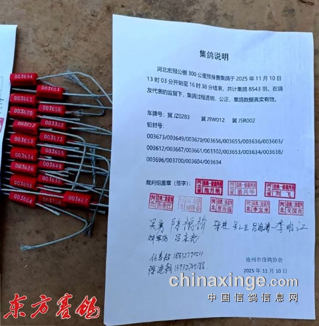 集鸽:11月10日下午集鸽,由沧州市信鸽协会派出裁判组执裁,200公里热身赛第6、106、206、306、406名作为鸽友代表参与全程监督。集鸽从13时03分开始至16时38分有条不紊地结束,共计集鸽8543羽。集鸽过程透明、公正,集鸽数据真实有效。