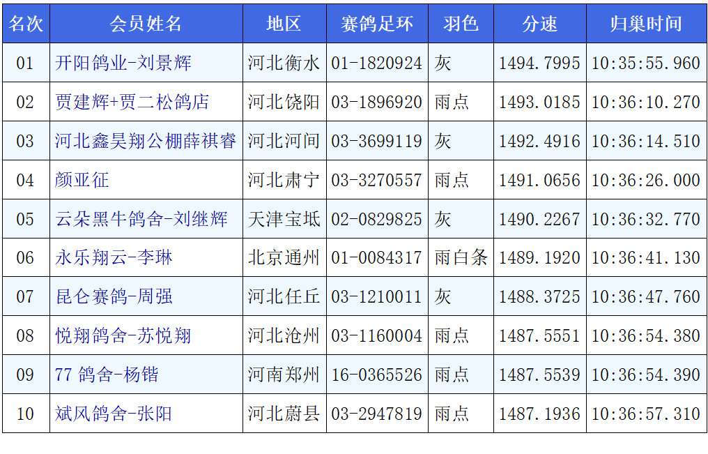 河北鸽友表现抢眼,包揽本关冠亚季军。衡水开阳鸽业-刘景辉麾下猛将01-1820924灰,以1494.7995米/分的分速摘取桂冠;