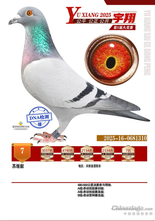 直播数据显示,本场比赛共计686羽赛鸽顺利报进,归巢率为55%。决赛冠军于当日12时45分29秒打钟,来自河南濮阳鸽友苏继献名下雨点赛鸽,足环号2025-16-0688834,平均分速达1548.5476米/分。值得一提的是,此鸽在预赛中已斩获第9名,两关接连闯入十强,战绩十分出彩。随后,苏继献名下另一羽雨点赛鸽,以1540.1066米/分的速度夺得季军,足环号2025-16-0688839。