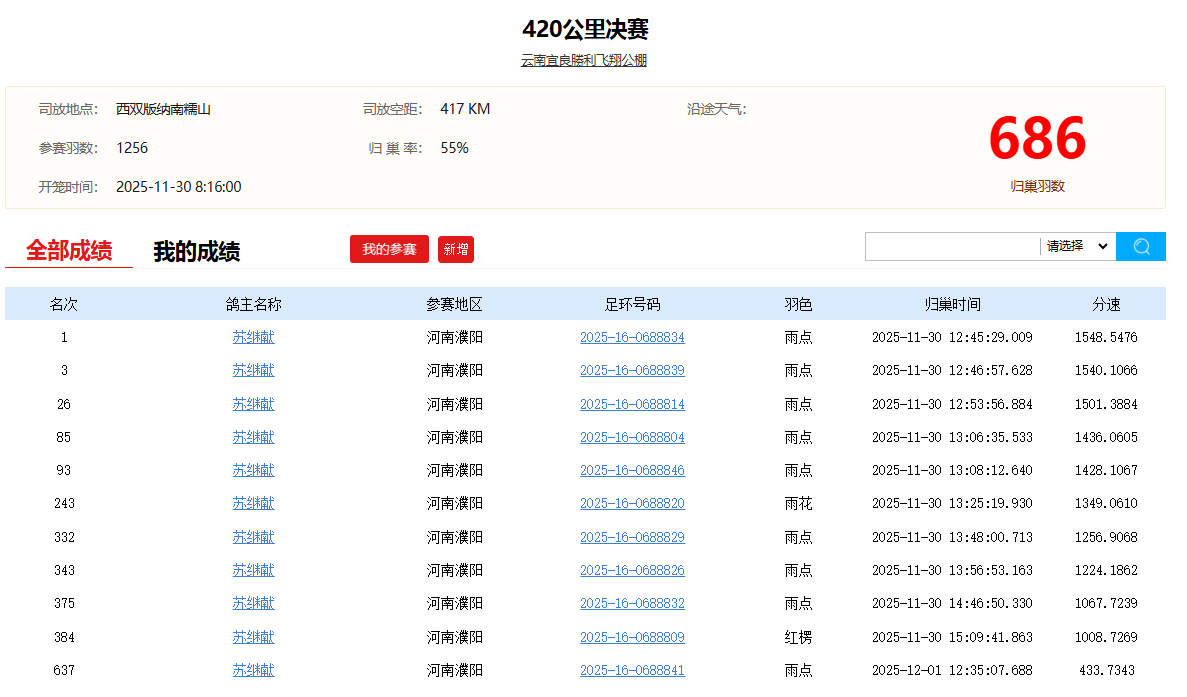 11月30日上午8点16分,云南宜良勝利飞翔公棚第三届420公里秋季决赛准时开笼,集鸽1256羽。司放地为西双版纳南糯山,参考空距417公里。按规程,本届每羽收参赛费1180元,决赛共取800个名次,前三名依次奖励30万、20万、15万。决赛报到期为时2天,放飞次日晚20点截止。