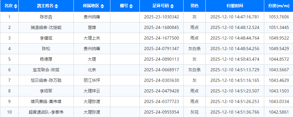 14时47分16秒,鸽友陈志垚的一羽2025-23-1030342率先进棚,羽色灰,分速1053.7606米/分,一举拿下加站赛冠军!
