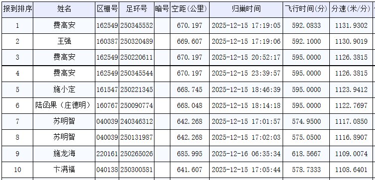 归巢消息:下午五点左右,赛鸽们开始陆续归巢。鸽友的费高安250345552,飞行空距670.197公里,分速1131.9302米/分,获得冠军。除此之外,他的另一羽250220611还获得了季军,能力十分强劲。鸽友王强的250320489获得亚军,飞行分速1130.9019米/分。截至开笼第二天早八点半,共有四百多羽赛鸽归巢。