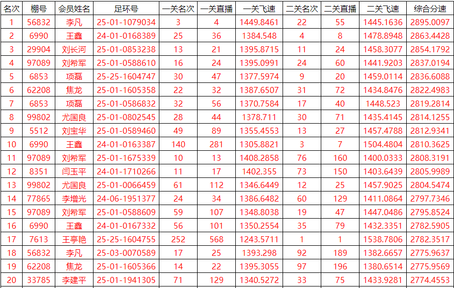 鸽友李凡一连报进两羽赛鸽,包揽了直播排名的季军、殿军。季军鸽2025030070655,于13时26分53秒报进,殿军鸽2025011079034,晚4秒报进,两羽赛鸽均为黄眼灰色雄鸽,空距503公里,分速分别为1450.1536米/分和1449.8461米/分。除季殿军外,李凡还获得了总排第11、第25、第27、第37、第83、第94名等好成绩。