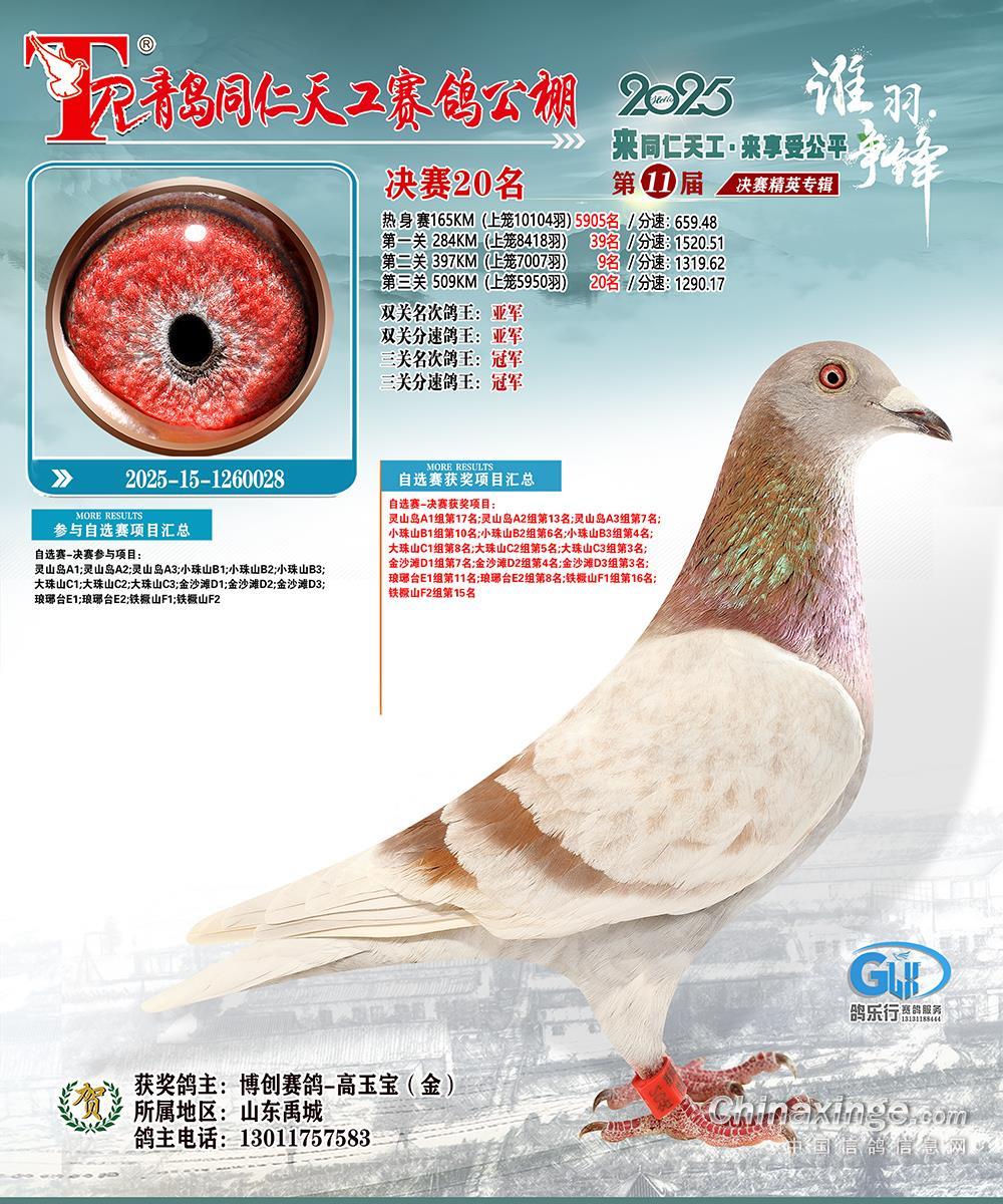 2025年第十一届秋季大奖赛,山东青岛同仁天工公棚以“以赛砺鸽、以质立棚”为办赛宗旨,走出了一条扎实稳健、精益求精的竞翔之路。在一场场秋日鏖战中,一羽来自山东禹城博创赛鸽-高玉宝名下的红轮横空出世,以无可争议的稳定表现强势问鼎三关鸽王冠军!此鸽环号为2025-15-1260028,在首关赛事中勇夺第39名,次关更是一举跃升至第9名,第三关虽面临激烈竞争,仍稳扎稳打斩获第20名。三关成绩出色,最终以绝对综合优势摘得桂冠,为本届秋赛写下辉煌一笔。