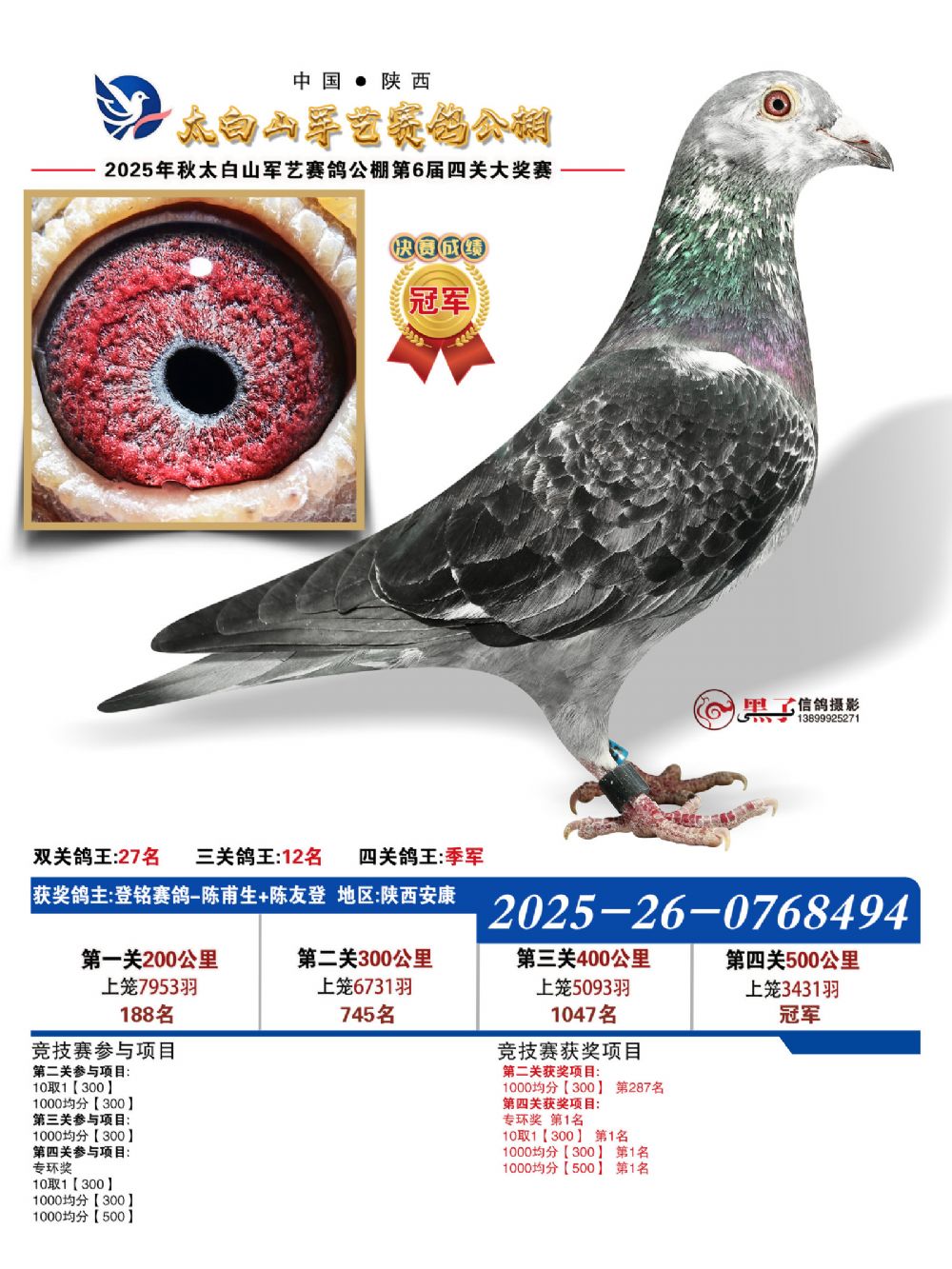 新一年新气象,凯歌响彻云霄!陕西太白山军艺公棚2025年第六届秋季赛事于1月初圆满落幕,飞越东北黄金赛线,历经200公里资格赛、300公里热身赛、400公里预赛,直至500公里终极决赛考验。在这条极具挑战性的多关赛道上,一羽出自登铭赛鸽-陈甫生与陈友登的超级战将,环号2025260768494,横扫千军,锋芒毕露!这羽花鸽不仅以绝对优势强势问鼎500公里决赛冠军,一路稳居前列,最终毫无悬念地加冕四关鸽王季军,成为今秋赛场上耀眼的一抹色彩。