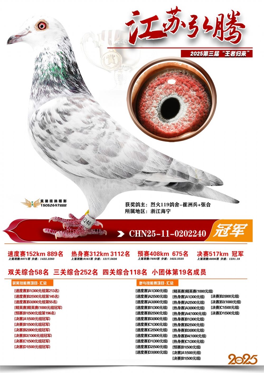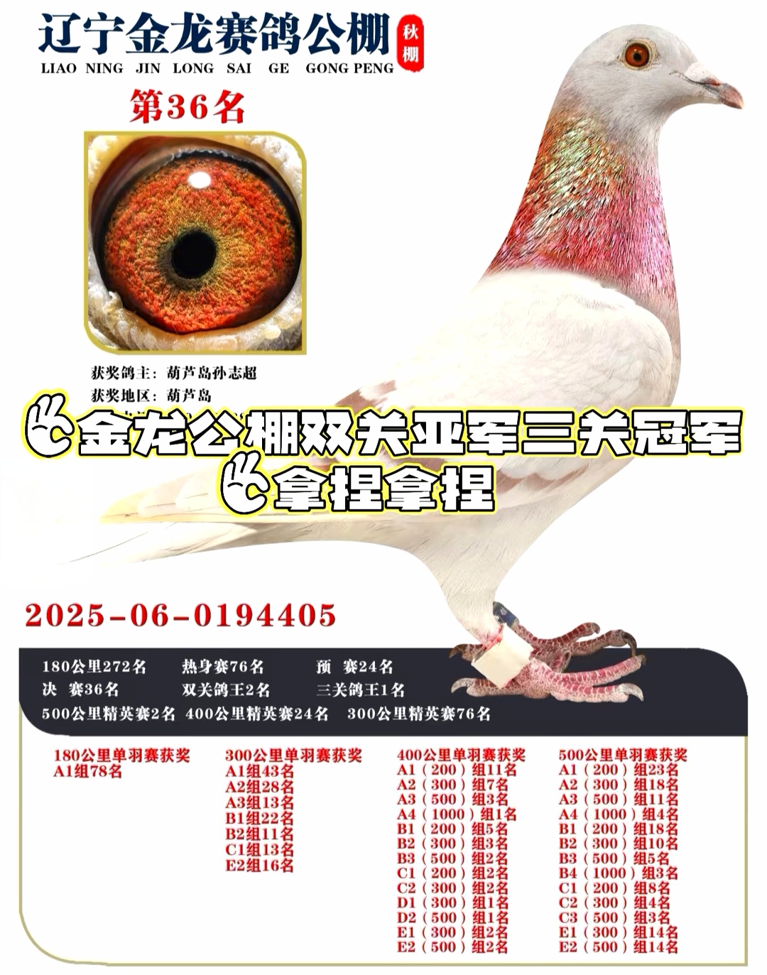 辽宁北镇金龙公棚2025年第十一届秋赛,办得精心、办得漂亮,再树行业标杆。本届设三关正赛,分别为300公里热身赛、400公里预赛、500公里决赛。当决赛尘埃落定,一羽红轮英雄的名字响彻赛场——来自葫芦岛孙志超名下的2025-06-0194405!此鸽首关76名、预赛24名、决赛36名,三关成绩均闯入前百,使其最终问鼎三关鸽王冠军,实乃一羽强悍的赛场英雄。